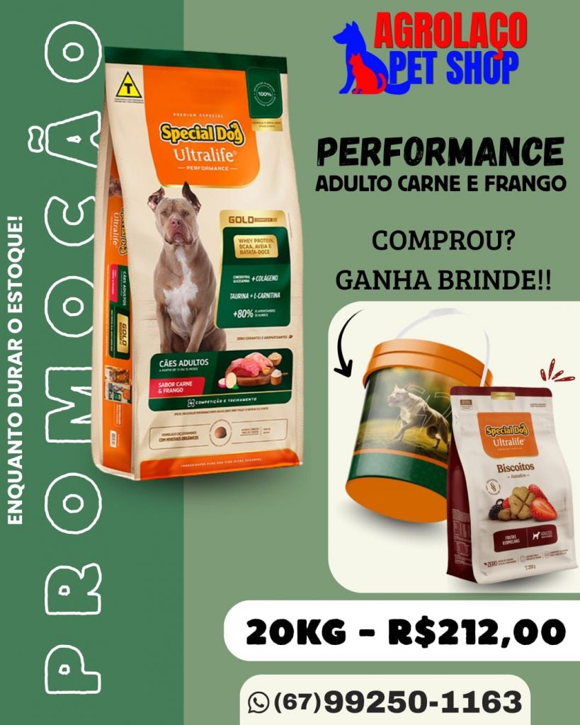 Veja essa: PERFORMANCE para cães adulto com carne ou frango apenas saca com 20 quilos por apenas R$ 212,00.
