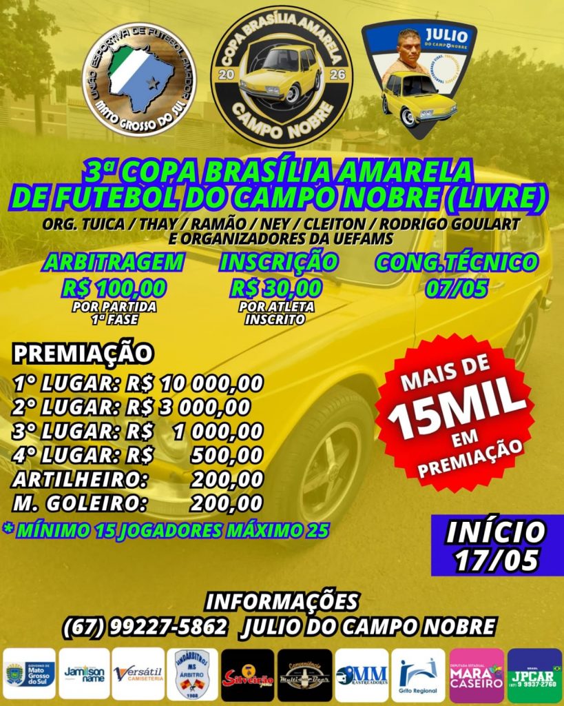 Não se assuste, pois quem ligar para o telefone do desportista Júlio do Campo Nobre e o mesmo estiver constantemente ocupado, será “normal”, pois nesta sexta-feira (27), começou a super corrida por uma das 24 vagas dos times que pretendem disputar a mais famosa competição do futebol amador na Capital de MS, desta feita, a 3ª Copa Brasília Amarela de Futebol do Campo Nobre – livre.