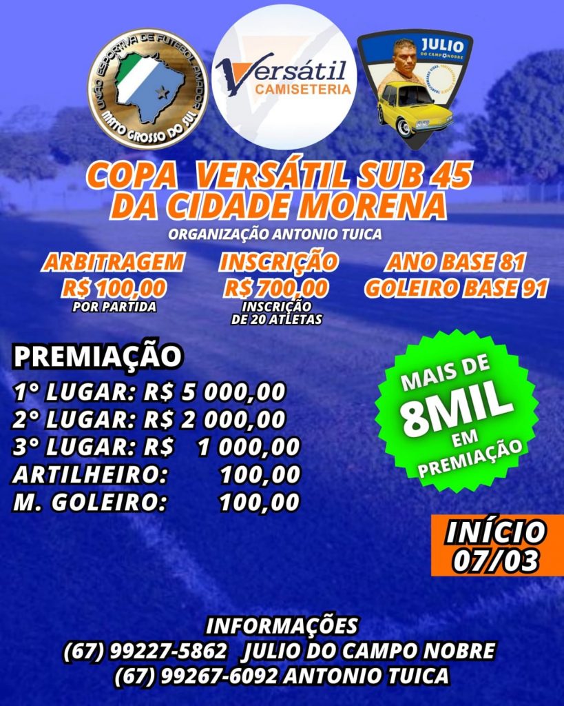 Esse é o caso especifico de Júlio do Campo Nobre que tirou uma semana para repor as energias positivas e agora, ao lado do Tuíca, devidamente aditivado, começa a se movimentar no sentido de concretizar as realizações de dois campeonatos apontados como “pontapé” inicial da temporada no futebol amador da Capital de MS, que são os campeonatos Copa Versátil Sub-45 da Cidade Morena e a Copa Master 35 da Cidade Morena.