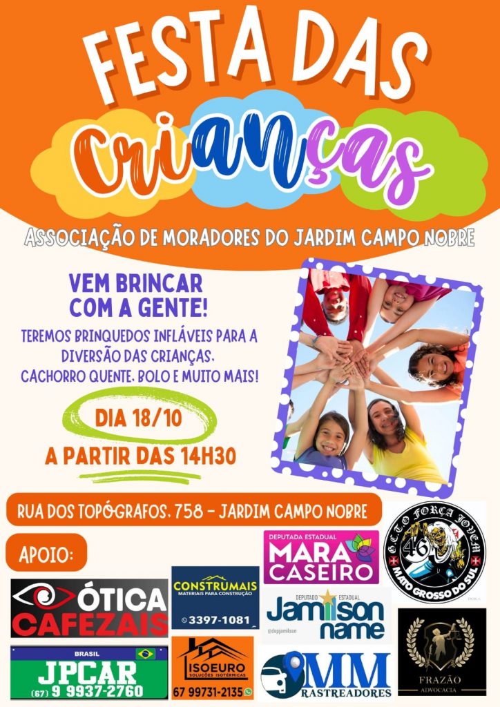 Devido ao grande número de programação voltada para  as crianças, neste  domingo dia 12 de outubro, Júlio do Campo Nobre, que é presidente da Associação dos Moradores do Jardim Campo Nobre, localizado no bairro Centro-Oeste, o maior e mais populoso  da Capital de MS e localizado na região do Anhanduizinho, onde residem 37.671 moradores distribuídos em 13 parcelamentos entre Jardins, Loteamentos, Parques e Residenciais, com mais uma jogada de mestre e sabiamente, além de fugir da concorrência que era muito grande, pois havia  festas e diversões em todos os lados,  ele decidiu realizar neste sábado (18), a tradicional festa voltada para a petizada, que uma vez mais, será feita na área  e no salão social da Associação de Moradores,  anexa à Arena Campo Nobre, com uma programação especial repleta de diversão, brincadeiras e distribuição de  bolos e claro,  o delicioso refrigerante para espantar o calor, entre outras guloseimas, que  serão oferecidas ao longo da tarde para dar mais energia aos participantes